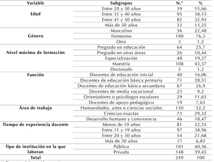 Este estudio contó con la participación de 249 docentes colombianos de 25 instituciones de educación inicial, básica y media vocacional de la ciudad de Bogotá: 10 públicas y 15 privadas. Todos respondieron al cuestionario de manera individual y en línea. De este grupo, 12 profesores participaron en dos grupos focales.