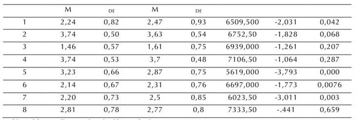 Para determinar el tipo de pruebas estadísticas a emplear (paramétricas o no paramétricas), se aplicó la prueba de Kolmogorov-Smirnov. Se obtuvo un grado de significación de p < 0,05 para todas las variables dependientes (vd), correspondientes a los ocho ítems del cuestionario. Dado que los datos no presentaban una distribución normal, se optó por un análisis estadístico no paramétrico. Para las comparaciones entre dos grupos, se utilizó la prueba U de Mann-Whitney, mientras que, en los casos con tres o más grupos, se aplicó la prueba de Kruskal-Wallis.