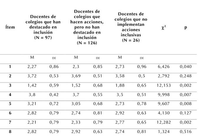 Tabla 4.: Resultados de los grupos de docentes en función de si su institución educativa se ha destacado o no en temas de inclusión