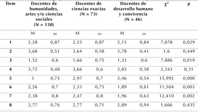 La Tabla 5 detalla las medias, desviaciones estándar y los estadísticos inferenciales para los tres grupos de docentes en relación con esta variable.