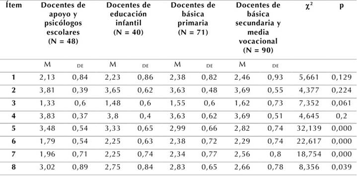 Tabla 6.: Resultados de los grupos de docentes en función del nivel educativo en el que laboraban los participantes