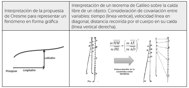 Con respecto a este y otros muchos conceptos de la matemática, representaciones no institucionales han estado presentes en la historia del desarrollo de las ideas matemáticas, como es el caso de las ideas propuestas por Oresme (Edwards, 1937) y Galileo (Azcárate, 1984) sobre la covariación entre variables, que llevaron posteriormente al desarrollo del concepto de función. Las representaciones presentadas por Oresme y Galileo muestran ideas intuitivas que surgieron para dar respuesta a un problema físico (tiempo y velocidad, cuerpo que cae considerando tiempo y distancia recorrida, etc.). Así dieron cuenta de un pensamiento divergente para proporcionar soluciones creativas y funcionales (véase la figura 3).