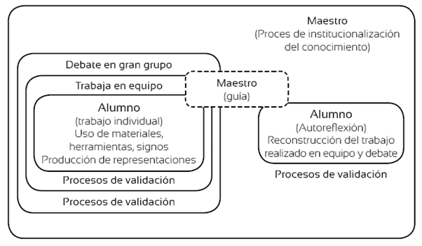 Etapa 5. Institucionalización del conocimiento. Procesos de institucionalización y uso de representaciones institucionales. En esta etapa, el maestro resume los resultados de los equipos, muestra la evolución de las representaciones espontáneas que emergieron en las etapas anteriores y discute su eficacia antes de introducir las representaciones institucionales y los procesos correctos.
