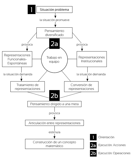 Es importante mencionar que el paso entre acciones y operaciones está determinado tanto por un medio sociocultural del aprendizaje como por la promoción de tratamiento entre representaciones que llevarán a la evolución de las RF-E hacia las representaciones institucionales (Rl).