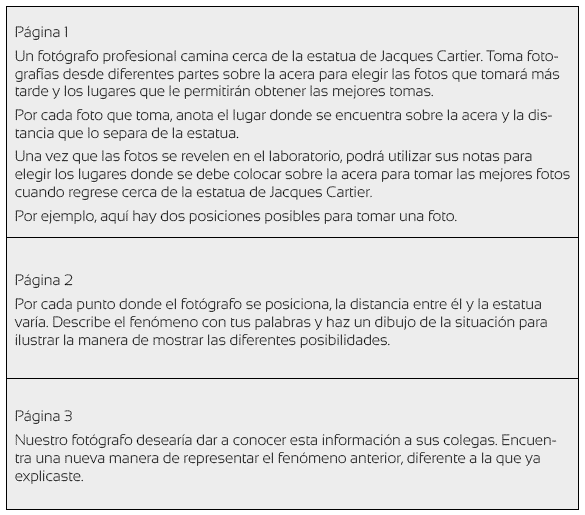Posteriormente en un segundo momento, se pide a los estudiantes que trabajen en colaboración en equipos de cuatro personas para comparar sus ideas y lograr expresar un dibujo o diagrama como una construcción social de conocimientos que explique el problema a través del diálogo. Cuando todos los equipos han llegado a una representación, se pide que presenten al resto del grupo sus respuestas. Por último, cada equipo puede decidir si mantiene su esquema propuesto o cambiarlo de acuerdo a lo que sus compañeros indican. Es importante mencionar que el rol del docente, además del diseño de la situación, es la orquestación de la interacción social en los equipos de trabajo a través de preguntas que guíen el proceso de aprendizaje desde una perspectiva sociocultural, como la referida por Bartolini Bussi y Boni (2003). La figura 6 muestra las tareas propuestas a los estudiantes en la actividad "El fotógrafo".