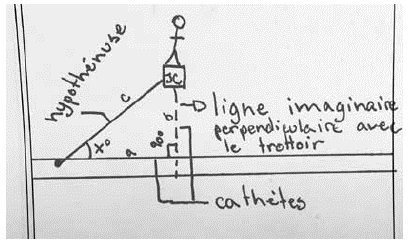 En la segunda representación, A2 escribe el nuevo acercamiento de su equipo de manera global e incluye las variables que él mismo no había considerado y que fueron aportadas por A1 En la representación es posible apreciar conceptos como hipotenusa, catetos y ángulos, en el dibujo que se representa mediante un triángulo. Es importante notar que a diferencia del primer esquema presentado por A1 en esta representación se considera la estatua como un punto, a pesar de que el dibujo es una figura en forma de hombre. Además, plasman las ideas respecto a la variación del ángulo.