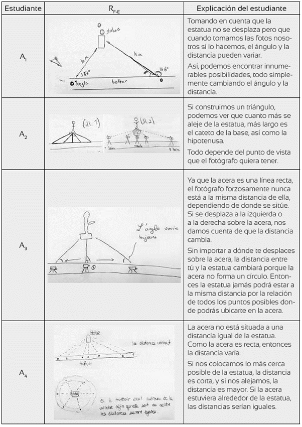 El cuarto estudiante, A4, expresa con mayor claridad un fenómeno de covariación entre la distancia del fotógrafo al moverse y la distancia entre el fotógrafo y la estatua. Incluso, propone un ejemplo en donde la distancia del fotógrafo a la estatua no varía, al considerar un círculo como acera.