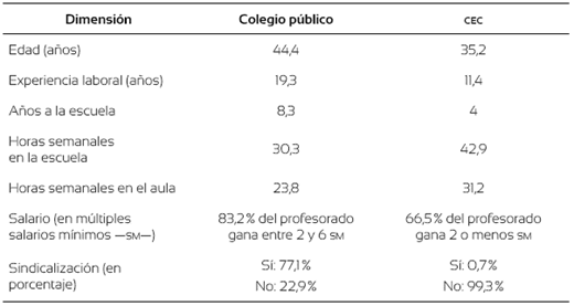 Tabla 1: Condiciones laborales del profesorado de las escuelas públicas y de los CEC en Bogotá
