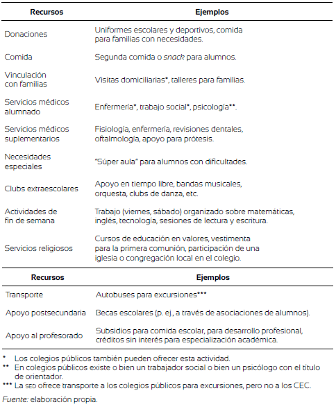 Tal como se destacó previamente, los CEC se instalaron en nuevos edificios con equipamiento moderno. A estos costes iniciales, las direcciones de los CMO y CEC han añadido una serie de nuevos recursos. La tabla 2 sintetiza los varios tipos de recursos: tal como se observa, los CEC ofrecen donaciones al alumnado y familias en forma de asistencia para uniformes y comida, así como comidas extra para el alumnado en los colegios -que van más allá de lo requerido en los contratos de los CEC-. Otros recursos se relacionan con la salud y servicios médicos; si bien los colegios públicos ofrecen algunos de los mismos servicios suplementarios que los CEC, como psicólogos, o trabajadores sociales. La diferencia, sin embargo, es la ratio de alumnos por especialista, tal como el director de una oficina local de la sed de Bogotá comentó: