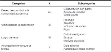 La tabla 1 muestra las categorías y subcategorías y la frecuencia de respuestas en los temas centrales. Al respecto de los motivos para publicar en la revista, advertimos que son aquellos que los encuestados aseveraron tener y, como en toda investigación que incluya opiniones, las respuestas pueden estar sesgadas o influidas por el contexto social o laboral.
