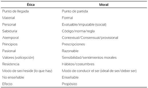 El significado de ética que se trata en este estudio es el que explicita José Luis López Aranguren (1994) en su intento de dar luces para comprender la diferencia entre ética y moral. Aranguren expone la transformación del uso de los términos ἦθος y mos y concluye que en latín no hay una palabra para traducir ἦθος, de tal modo que esta indiferencia verbal entre ἦθος y mos ha tenido gran influencia en la comprensión de la ética (1994, pp. 19-26). A partir de esto, nosotros trazamos la distinción de la siguiente manera:
