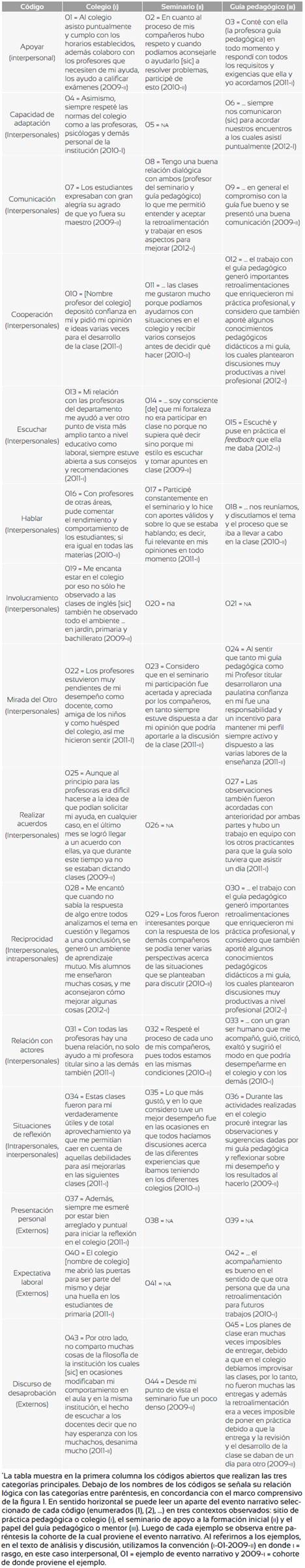 De acuerdo con el marco comprensivo descrito en la figura 1, hay tres rasgos para caracterizar la práctica pedagógica desde el ámbito de lo social: aspectos interpersonales, intrapersonales y externos. Estos se observan en los contextos mencionados: el sitio de práctica pedagógica o colegio, el seminario de apoyo a la formación inicial y el papel del guía pedagógico o mentor. Ejemplificaremos algunos casos seleccionados (45 citas para este artículo)1, que hemos sistematizado en la tabla 1, por la limitación de espacio. Para una discusión y ejemplificación más amplias se puede consultar Castañeda-Peña, Rodríguez-Uribe, Salazar-Sierra y Chala-Bejarano (2016a) y Castañeda-Peña et al. (2016b).