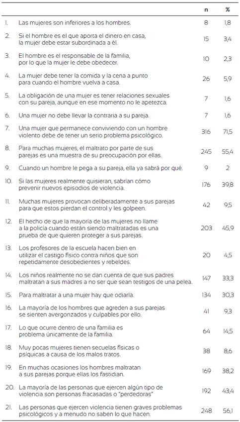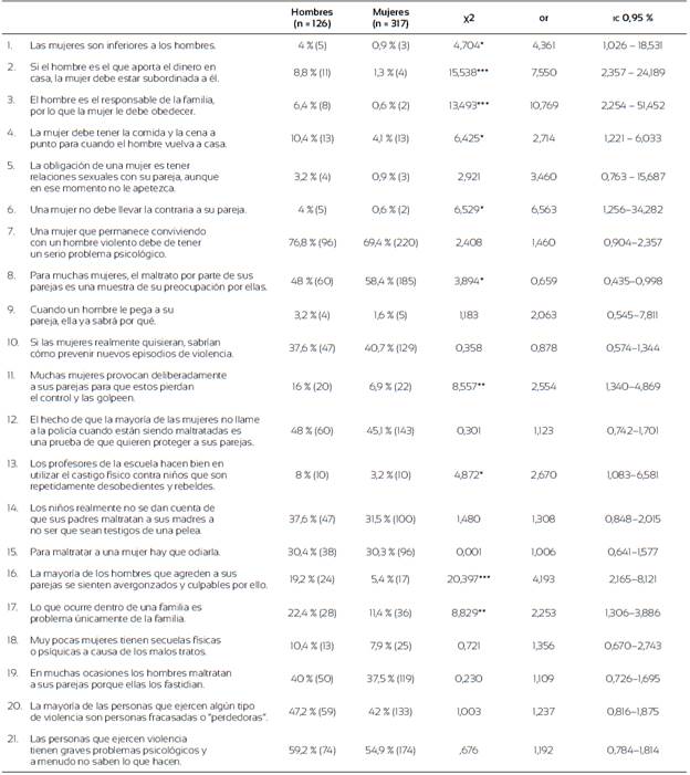 La tabla 3 muestra las diferencias entre hombres y mujeres en la aceptación de las creencias distorsionadas sobre los roles de género y el uso de la violencia. Los hombres presentan un mayor acuerdo en prácticamente la totalidad de las creencias analizadas. Además, son quienes tienen un mayor riesgo de presentar distorsiones cognitivas sobre la violencia contra las mujeres. Se encuentran diferencias estadísticamente significativas entre hombres y mujeres en los sesgos relativos a la supuesta inferioridad de las mujeres y a su encasillamiento en el rol tradicional (ítems 1, 2, 3, 4 y 6). También se hallan diferencias en los sesgos relacionados con la culpabilización de la mujer víctima de violencia (ítem 11) y con la minimización de esta forma de violencia y la exculpación del agresor (ítems 16 y 17), siendo los hombres quienes presentan mayores porcentajes de acuerdo.