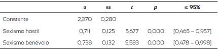 Para predecir las distorsiones cognitivas sobre los roles de género y la violencia contra las mujeres en la pareja, se realizó un análisis de regresión lineal múltiple, utilizando como variable dependiente el número de sesgos cognitivos en el IPDMUV-R. Los resultados del análisis reportan que los sesgos cognitivos sobre la violencia contra las mujeres se pueden estimar a partir del sexismo hostil y del sexismo benévolo (tabla 6). El modelo predice el 17,9 % de la varianza y cumple con el supuesto de no multicolinealidad (FIV = 1,130) y con el supuesto de independencia de errores (Durbin-Watson = 1,972). La figura 1 muestra los coeficientes estandarizados y el coeficiente de determinación (coeficiente de regresión = 0,423; Anova, F = 47,927, p = 0,000).