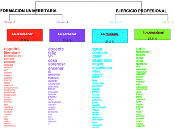 En el caso del mundo de la formación universitaria, un 24,6 % (clase 1, en rojo) de unidades léxicas se asocia con los significados de lo disciplinar o los saberes académicos de la carrera que cursan, frente a un 25,4 % (clase 4, en violeta) que activa significados de lo personal, como las motivaciones particulares de los autores para estudiar esta carrera, sus trayectorias de vida y la afirmación de subjetividades. En el caso del mundo del ejercicio profesional, domina un 28,2 % (clase 3, en turquesa) de significados agrupados en torno a la representación de lo misional de la labor docente, esto es, la función social ejercida desde la profesión particular; en el mismo mundo lexical, pero con una incidencia menor (21,8 %, clase 2, en verde), se visualiza el ejercicio profesional desde las problemáticas de coyuntura política, a propósito de un cese de actividades docentes y movilizaciones públicas llevadas a cabo por los profesores de las escuelas y colegios del país, durante 37 días, desde el 16 de mayo de 2017 (Semana.com, 2017).