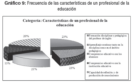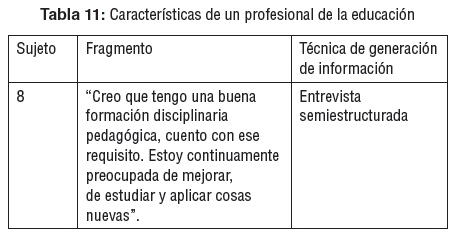 En la categoría características de un profesional de la educación, se mencionaron cuatro subcategorías con una frecuencia similar. La primera es la formación disciplinar y pedagógica del profesor, en donde uno de los rasgos mayormente mencionados es el poseer un buen manejo del idioma inglés. Otra característica es el aprendizaje continuo, tanto en la disciplina como en el ámbito pedagógico, donde el perfeccionamiento, la autonomía y la actualización en distintas áreas adquieren un rol fundamental. Un tercer grupo considera muy relevante mantener un compromiso educativo con los estudiantes. Un número similar de profesores manifiesta la importancia de que un profesor practique la reflexión de su práctica pedagógica; sin embargo, manifestaron no hacerlo con la frecuencia apropiada. Respecto a producir conocimiento, la mayoría planteó la necesidad de una mayor cantidad de investigaciones. Finalmente, la característica menos mencionada es el compromiso con la institución educativa (Ver tabla 11). A continuación se observan algunos fragmentos de las entrevistas semiestructuradas donde los informantes clave mencionan las características de un profesional de la educación.