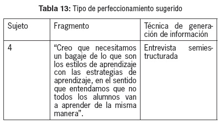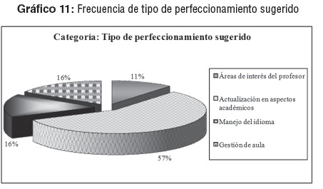 Con respecto al tipo de perfeccionamiento sugerido para los docentes de inglés en Chile, se manifiesta primordialmente la necesidad de actualización en nuevas metodologías de enseñanza de idiomas, TIC, estilos de aprendizaje, estrategias de aprendizaje, capacidad de reflexión y evaluación de proceso. En segundo lugar, se encuentra el mejoramiento del manejo del idioma y de la gestión de aula. Por último, en la subcategoría áreas de interés, se mencionan las neurociencias (conjunto de ciencias cuyo objeto de investigación es el sistema nervioso, con particular interés en cómo la actividad del cerebro se relaciona con la conducta y el aprendizaje) y las pasantías, definidas como un conjunto de actividades de carácter práctico realizadas por el profesional de la educación, que le permitirán la aplicación en forma integrada y selectiva de conocimientos, habilidades, destrezas, aptitudes y valores en casos concretos del campo educacional. Además se mencionan algunas áreas específicas relacionadas con la enseñanza y aprendizaje del inglés.
