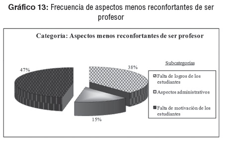 Al indagar respecto a los aspectos menos reconfortantes de ser profesor, se puede observar que, en primer lugar, se encuentra la falta de motivación de los estudiantes por aprender. Esto se ve reflejado en un excesivo interés por aprobar asignaturas, la no realización de trabajos, la falta de rigurosidad o la escasa participación durante las clases. Por otro lado, los profesores manifiestan sentirse frustrados cuando sus estudiantes no logran los objetivos propuestos. Finalmente, se mencionan algunos aspectos administrativos, tales como bajo sueldo, carga horaria o trabajo administrativo (Ver tabla 15). El siguiente cuadro contiene fragmentos de la entrevista semiestructurada que ilustran lo anterior.
