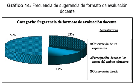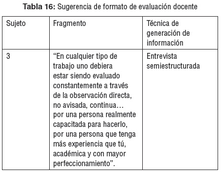 En cuanto a la evaluación docente, la totalidad de los profesores se declaran totalmente partidarios de esta. En la próxima categoría, sugerencia de formato de evaluación docente, la mayor parte de los profesores sugieren la observación directa en el aula debido a que esta permite percibir de manera inmediata y fidedigna los diversos fenómenos que ocurren dentro de la sala de clases. La segunda mayoría señaló la importancia de que la evaluación docente se lleve a cabo por un especialista del área, por un profesional que pueda aportar concretamente a la superación de aquellas áreas que se observen débiles. Un tercer grupo sugiere que la evaluación docente debiera tener en cuenta la participación de distintos agentes del ámbito educativo, tales como: coordinadores de área, profesionales pares y/o estudiantes que evalúen las competencias del docente (Ver tabla 16). La siguiente tabla contiene algunos fragmentos de la entrevista semiestructurada donde se proponen distintas sugerencias.