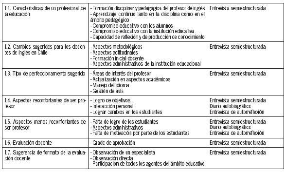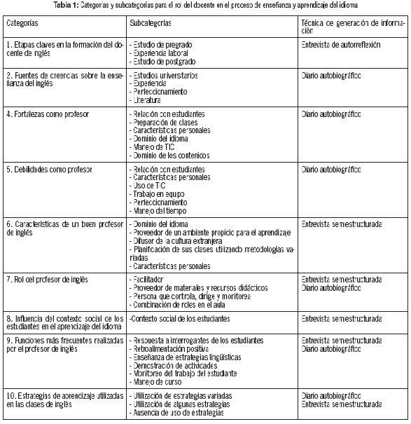 Esta dimensión comprende el rol del docente en el proceso de enseñanza y aprendizaje del idioma. Se establecen 16 categorías, la mayoría de las cuales se divide en subcategorías que emergen del discurso de los informantes (Wilkinson y Birmingham, 2003) ya sea en la entrevista semi-estructurada, de autorreflexión o en el diario autobiográfico (ver tabla 1).