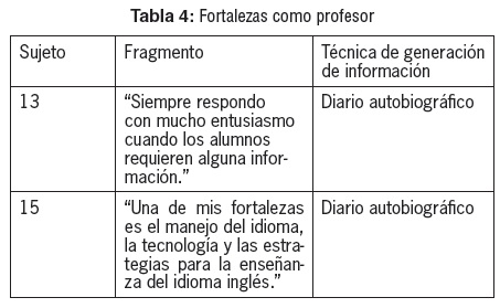 En la categoría fortalezas como profesor, los profesores concuerdan en considerar aspectos tales como: el manejo del idioma, el dominio de las TIC o del tema que enseñan. Asimismo, coinciden en mencionar la buena relación con sus estudiantes y la preparación de sus clases. Del mismo modo, señalan ciertas características personales que ellos poseen y que contribuyen tanto al ambiente que se genera en la clase como al aprendizaje efectivo. En la siguiente tabla se aprecian algunos fragmentos de sus diarios autobiográficos seleccionados para respaldar las subcategorías antes mencionadas.