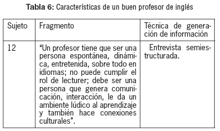 Es interesante destacar las características que para los informantes posee un buen profesor de inglés. Todas ellas aluden a rasgos que propicien un ambiente apropiado y facilitador del aprendizaje; además, destacan la importancia de sentirse seguros del dominio del idioma que se está ensañando y de planificar las clases de acuerdo a metodologías innovadoras. En este mismo sentido, la mayoría se identificó con el rol de profesor como fuente de recursos, quien está siempre disponible para consultas o para entregar sugerencias, además de permitir al estudiante que sea protagonista de su desarrollo lingüístico.