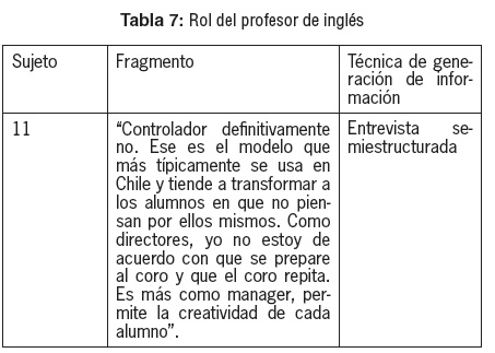 Para indagar acerca del rol que frecuentemente el profesor adopta en el aula, se les solicitó a los informantes que se identificaran con uno o más roles, de un listado propuesto por Brown (2001). La mayor parte se identificó con el rol del profesor como fuente de recursos, rol en el que él o ella adopta un segundo plano para permitir que sus estudiantes procedan con su desarrollo lingüístico, estando siempre disponible para entregar sugerencias cuando el estudiante las busca.