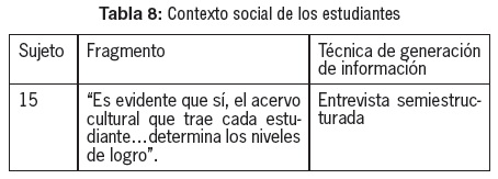 Cuando se les consultó a los profesores si el contexto social de sus estudiantes influía en el proceso de enseñanza y aprendizaje, la respuesta generalizada fue que contribuía en gran medida por distintas razones. Por un lado, porque el contexto social influye en la riqueza cultural de los estudiantes y es considerado como una herramienta importante durante las clases de idioma. Por otro lado, el contexto social determina, en cierta medida, las creencias, las actitudes y las aspiraciones que los estudiantes demuestran y/o declaran. En la siguiente tabla se presentan algunos fragmentos de la entrevista semiestructurada, seleccionados con el fin de ilustrar las subcategorías antes mencionadas.