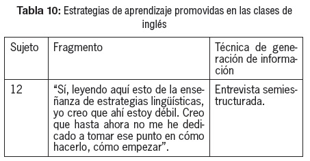 Al momento de ser consultados respecto a la categoría estrategias de aprendizaje promovidas en las clases de inglés, la mayoría de los profesores manifestó no enseñar estrategias de aprendizaje por desconocimiento del concepto o por no distinguir las estrategias adecuadas para trabajar las distintas habilidades. La menor parte de los profesores manifestó enseñar estrategias, no sólo lingüísticas, sino también de aprendizaje. Este grupo declara que para enseñar un idioma es imprescindible no solo conocer las estrategias de aprendizaje y usarlas durante las clases, sino enseñarlas explícitamente a los estudiantes para que puedan aplicarlas en otros contextos. A continuación se aprecian algunos fragmentos de la entrevista semiestructurada seleccionados para ejemplificar estas aseveraciones.