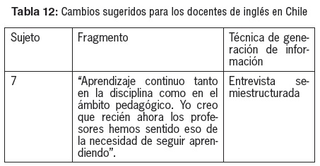 Al ser consultados respecto a si consideraban necesario realizar cambios en la docencia del inglés en Chile, emerge la categoría cambios sugeridos para los docentes de inglés en Chile. Los docentes mencionaron, en primer lugar, aspectos relacionados con cambios de actitud, tales como: desarrollo de la autocrítica, trabajo en equipo o mayor autonomía. El segundo lugar lo comparten aspectos metodológicos y aspectos administrativos tales como la disminución de la carga académica, el número de estudiantes por sala o el perfeccionamiento dentro de los propios establecimientos. Cabe destacar la baja frecuencia que presenta la sugerencia de cambios a la formación inicial de los docentes. La siguiente tabla contiene fragmentos de la entrevista semiestructurada que ilustran lo anterior.