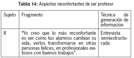 Dentro de los aspectos más reconfortantes de ser profesor, la mayor parte apuntó a la satisfacción que les producía comprobar que sus estudiantes aprendían y lograban los objetivos propuestos. Un segundo aspecto es la posibilidad de contactarse con los estudiantes en un plano más personal y de establecer relaciones con ellos. Parece interesante notar la importancia otorgada a lograr cambios en los estudiantes, no siempre asociados al aprendizaje del idioma (Ver tabla 14).