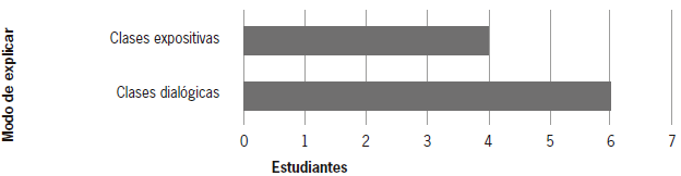 De igual forma, para responder el objetivo específico a, la figura 3 presenta los resultados obtenidos sobre la relación docente-teoría: modalidad de explicación (dimensión 3). Frente a ello, 4 estudiantes hacen alusión al predominio de clases expositivas y 6 estudiantes refieren a las clases dialógicas como estilo predominante en la carrera tomada como caso.