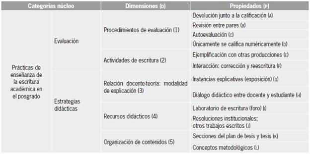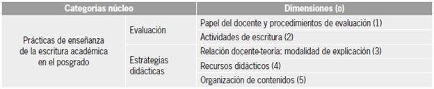 Como diseño de análisis adoptamos la teoría fundamentada de Strauss y Corbin (1998), en la medida en que los conceptos surgieron de los datos obtenidos en la investigación. Luego de elaborar los instrumentos con base en los objetivos de conocimiento, recolectamos la información y aplicamos el método de comparación constante (Glaser y Strauss, 1967). Una vez que identificamos categorías recurrentes en una misma entrevista y entre entrevistas diferentes, iniciamos el proceso de codificación abierta. Consiguientemente, determinamos categorías núcleo y dimensiones derivadas de esta elaboración preliminar. La tabla 1 explicita lo antedicho, entendiendo a la evaluación y las estrategias didácticas como conceptos centrales en la enseñanza de la escritura académica en el posgrado.