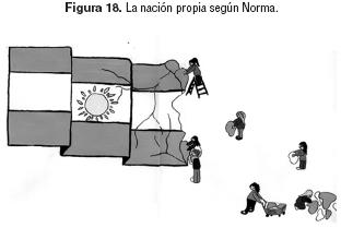 Norma: La imagen de nación está representada de la siguiente manera: con sus quebraduras y sus partes que le faltan, es porque la nación después de las cosas que le pasaron: guerras, golpes de Estado, mal manejo de la política y todo, se fue poco a poco destruyendo y las personas que se ven en el dibujo representan a la sociedad que quiere, desde mi punto de vista, tratar de mejorar lo que se perdió.