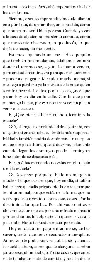 El imaginario social de la grandeza de la nación, reproducido en y desde la escuela, en relación con la idea de progreso vinculado al mundo del trabajo, el acceso a la educación formal a lo largo de la vida y a la movilidad social, no se encuentra clausurado del todo en la vida de estos jóvenes, pero es realmente un imaginario lejano de su cotidianidad, de su experiencia de todos los días.