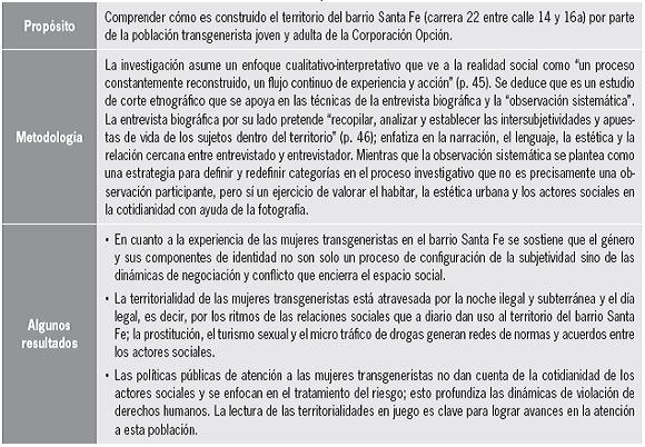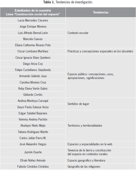 Estas preocupaciones complejizan la investigación sobre el espacio geográfico, pero también nutren y dinamizan las concepciones y lecturas de la espacialidad. En el siguiente cuadro se reflejan los trabajos adelantados y en curso de la línea. (tabla 1)