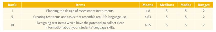 The quantitative results from the questionnaire also may be interpreted as feedback to design a course in which the design of assessment instruments is a pillar. Table 4 presents three top ranked topics that involve the design of language assessments; the low range of 2 suggests that there was agreement among all the teachers, who thought these topics were very important for the course.