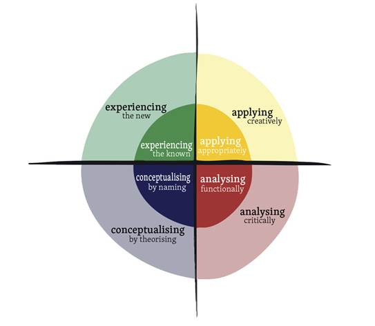 Recently, however, Cope & Kalantzis (2009b) explained that after a decade of revision of the initial proposal of ml, they have reframed these pedagogical components, “translated them into more immediately recognizable pedagogical acts or “knowledge processes” of experiencing, conceptualizing, analyzing and applying” (p. 184) (see Figure 1). Overall, these terms represent the same formulation that was initially proposed by the New London Group but provide further detail about how to better interpret each pedagogical move. For example: