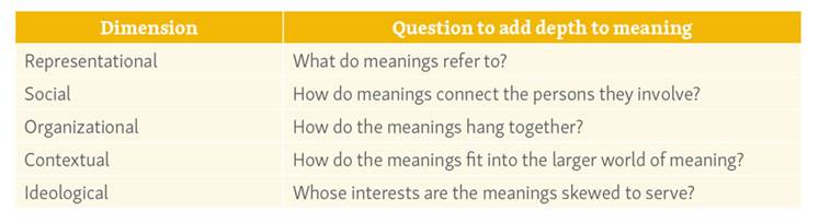 Cope & Kalantzis (2000, 2009a, 2009b) suggest that in an environment where Learning by Design takes place, five dimensions of meaning come into play (see Figure 2). The first dimension focuses on the understanding of what meanings refer to—Representational Meaning; the second looks at the relations are established between the meaning makers involved in the construction of a text and the text itself—Social Meaning; the third concerns how ensembles of meaning work together—Organizational Meaning; the fourth concentrates on how meanings fit into the larger social context—Contextual meaning; and the last one examines how meanings respond to the interest of meaning-makers—Ideological Meaning.