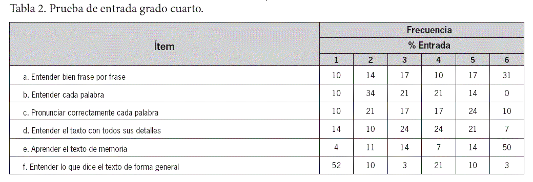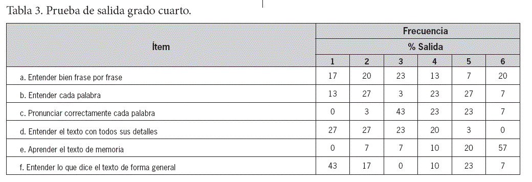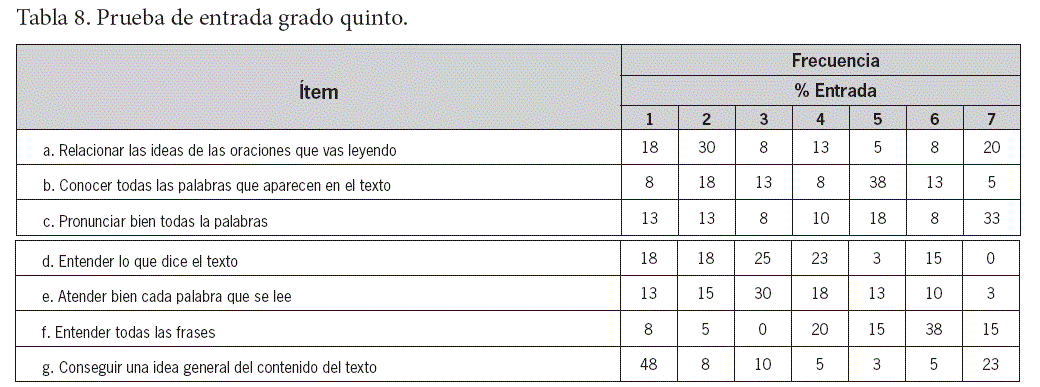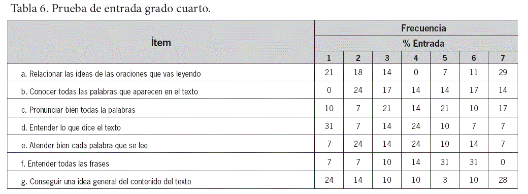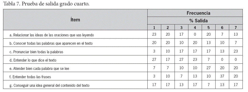 Tabla 7. Prueba de salida grado cuarto.Al analizar el consolidado de los datos que arroja el cuestionario de salida para esta pregunta, se puede ver que el aspecto que presenta el mayor índice de frecuencia en el primer puesto es el que corresponde al literal d, le sigue el literal a, el b y el g; éstos son los que obtienen los puntajes más altos en la escala de valoración. Los literales a y g son complementarios del d, lo cual deja ver que se ratifica el hecho de que la lectura implica, ante todo, la comprensión del texto, y que esto entraña conseguir una idea general del contenido del texto y relacionar las partes del mismo para, entonces, entender lo que el texto plantea. Mientras esto se asume como lo importante, pronunciar bien las palabras o entender todas las frases no se ven como los aspectos más importantes que se deben adelantar para hacer una lectura adecuada.
