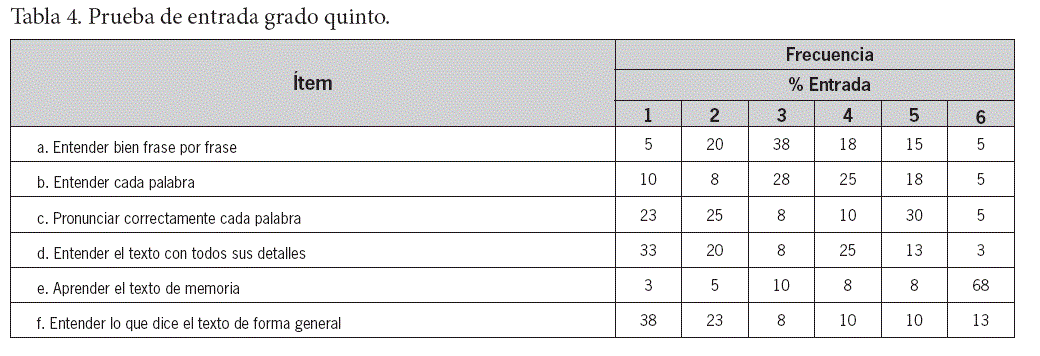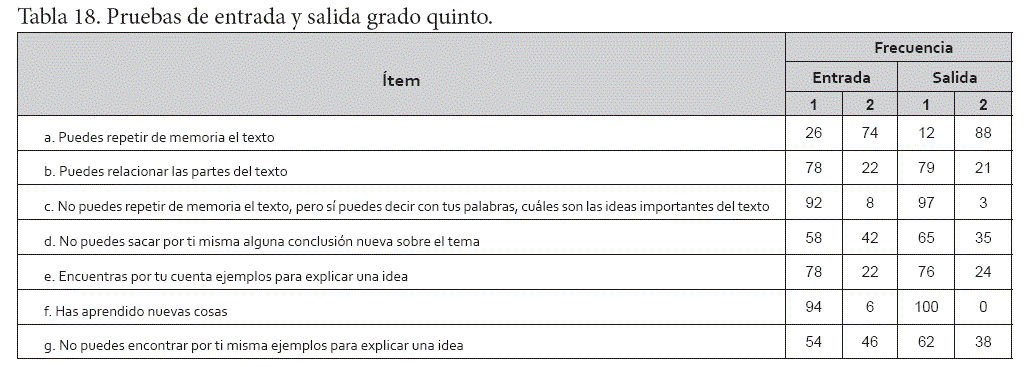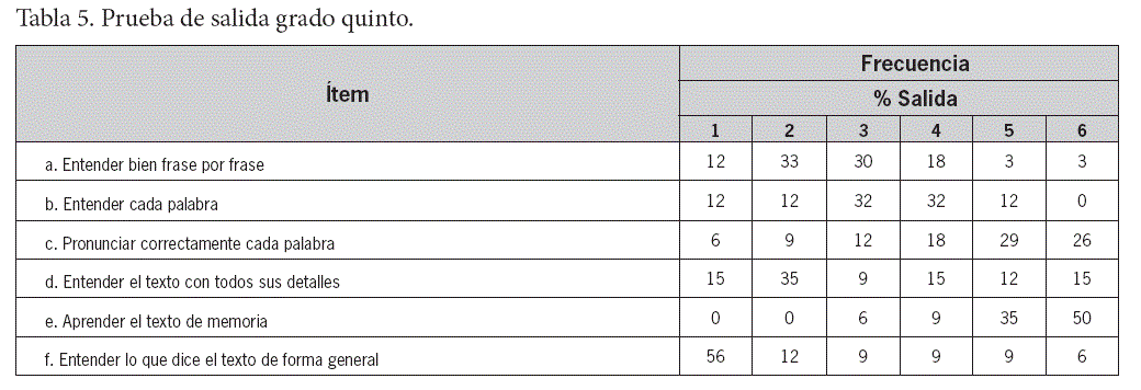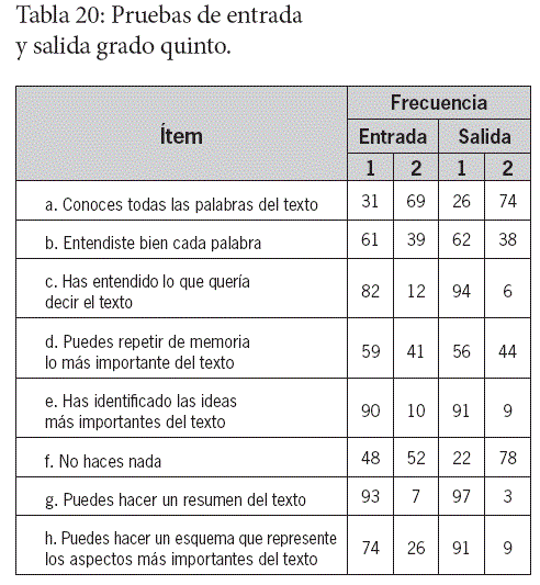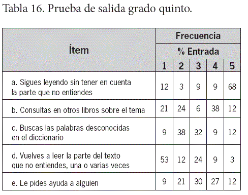 Tabla 5. Prueba de salida grado quinto.Al analizar los datos consolidados del cuestionario metacognitivo de entrada con respecto a los del cuestionario de salida, se ve que se mantiene el hecho de que el literal que presenta el mayor índice de frecuencia en cuanto al nivel de importancia más alto sigue siendo el literal f, el cual presenta, además, un incremento del 14% en el grupo de estudiantes que plantean, que el objetivo persiguido a la hora de leer es entender lo que dice el texto de forma general, esto es, construir una representación mental del contenido fundamental del texto. Asimismo, tanto el literal b como el d ocupan el segundo lugar. Para el caso del literal b, se presenta un aumento del 5% en el porcentaje de estudiantes que le asigna el puntaje más alto, de tal forma que se pasó del 10% al 15%. Por su parte, el literal d presenta una reducción del 8% en el grupo de estudiantes que le asignó el primer lugar, al mismo tiempo se dio un aumento del 21% en el grupo de estudiantes que le asigna un nivel de importancia a este aspecto, pero lo deja en el segundo lugar.