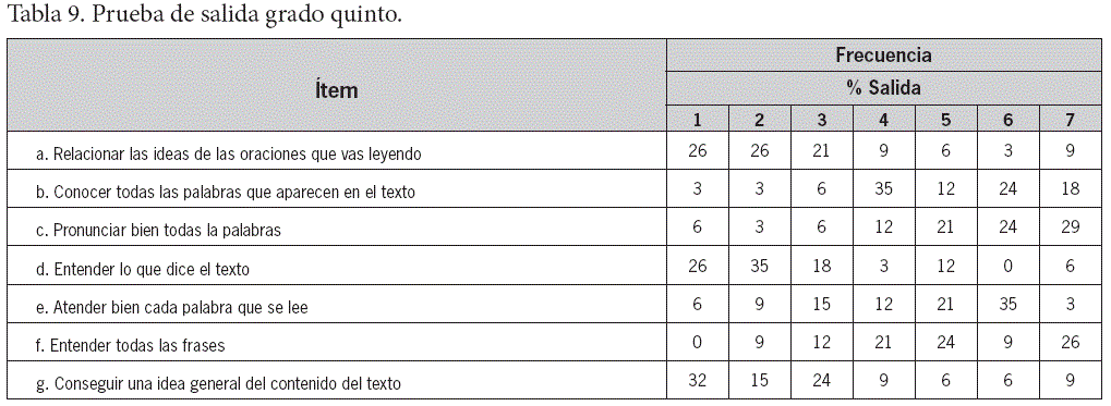 Tabla 9. Prueba de salida grado quinto.El consolidado de los datos de salida para esta pregunta permite observar que si bien el ítem g sigue teniendo un índice de frecuencia alto, el porcentaje de estudiantes que planteaba que éste era un aspecto importante al leer se reduce en un 18%, mientras que el ítem a se incrementa en un 12%, obteniendo así el mismo índice que el literal g. Lo anterior muestra que aunque se mantiene el hecho de que entender el texto es un aspecto central para considerar que una lectura es buena, también se establece por parte de un grupo de estudiantes que relacionar las ideas del texto es un hecho igualmente importante para garantizar una buena lectura. Entre tanto, el literal d presenta un incremento del 4%, de tal forma que un 22% de las estudiantes ve este aspecto como indicador significativo para un ejercicio de lectura adecuado; asimismo, se incrementa el grupo de estudiantes que le asigna a este literal d el segundo valor de la escala al pasar del 18% al 41%, con lo cual están reconociendo el papel positivo de éste en la lectura. Por otro lado, aspectos como conocer todas las palabras del texto o pronunciarlas bien, así como entender todas las frases, se asumen como hechos que no son tan importantes, de ahí que las valoraciones que obtienen sean en el rango medio y bajo de la escala, tanto así que el literal c tiene el mayor índice de frecuencia en lo que al puntaje más bajo se refiere, seguido por el literal f.
