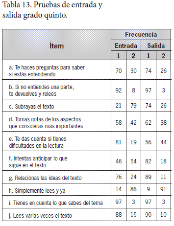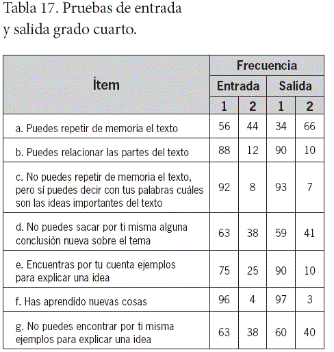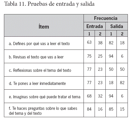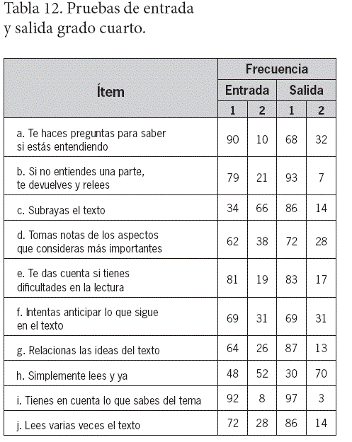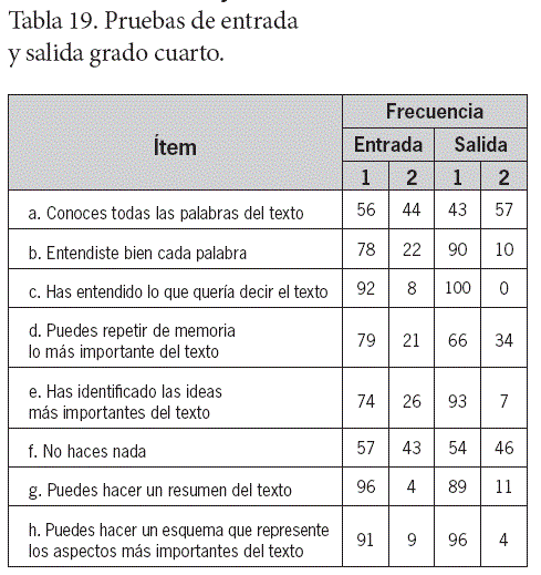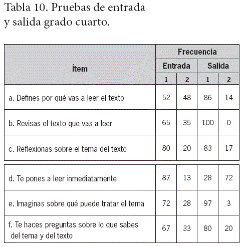 Tabla 10. Pruebas de entrada y salida grado cuartoComo se puede ver, los literales relacionados con las actividades asociadas a la prelectura presentan una mejora en la percepción de las estudiantes, lo cual supondría que han entendido que antes de iniciar una lectura se hace necesario establecer el porqué del trabajo, analizar la tarea, activar conocimientos previos o tenerlos en cuenta, revisar el texto para tener una primera aproximación a éste, entre otras actividades. Así, se presenta una cualificación en el caso de plantear que se hace necesario, antes de empezar a leer un texto, definir por qué se va a leer, aquí -como se indicó- hay un aumento del 34% en la percepción positiva frente a este hecho; asimismo, se incrementa en un 35% la percepción positiva para el caso de explorar el texto para tener una primera aproximación a éste; de igual forma se da un aumento en el caso de predecir el contenido del texto y hacer preguntas sobre los conocimientos previos que se tiene sobre el tema y el texto.