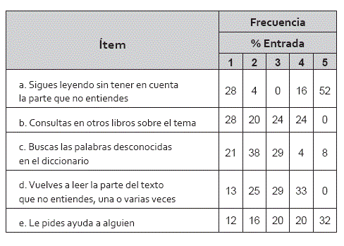 De acuerdo con el consolidado de los datos que ofrece el cuestionario de entrada, se hace evidente que el ítem que presenta el mayor índice de frecuencia corresponde al d, de tal forma que el 44% de las estudiantes señala que releer es una estrategia adecuada cuando no se entiende una parte del texto; asimismo, consultar en otros textos también se ve como una estrategia pertinente, al igual que consultar en el diccionario las palabras desconocidas. Ahora bien, en el nivel bajo de la escala de valoración de esta pregunta, el ítem a es el que presenta el mayor índice de frecuencia, es decir, seguir leyendo pese a no entender una parte no es una acción adecuada.