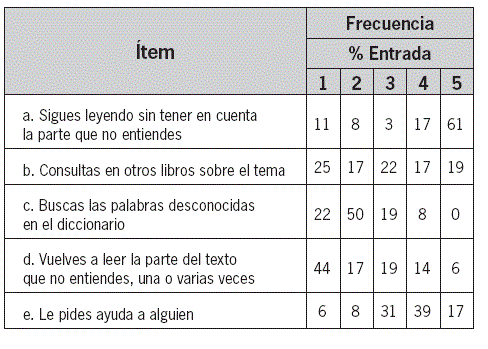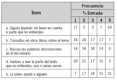 El consolidado de los datos que presenta el cuestionario de entrada para esta pregunta deja ver que la opinión de las estudiantes señala que realizan algunas acciones para solucionar los problemas que se les presentan cuando están leyendo. Entre dichas acciones, se encuentra consultar otros textos, utilizar el diccionario; en menor medida, releer y buscar ayuda. Frente a esto, el ítem que tiene el mayor índice de frecuencia baja en la escala propuesta corresponde al que plantea que si hay alguna dificultad se sigue leyendo sin hacer nada al respecto, lo cual implica cierta cualificación en este aspecto, en la medida en que las estudiantes asumen que si tienen dificultades de comprensión al leer pueden adelantar una serie de actividades que les permitan solucionarlas y adelantar de mejor manera la tarea lectora.