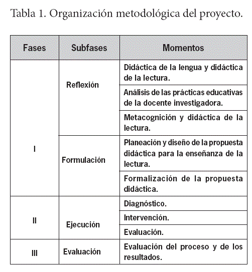 Esta propuesta metodológica implica la reflexión sobre áreas problemáticas: por un lado, la planificación y ejecución de acciones para abordar dicha situación y por otro, la evaluación del proceso y los resultados de la intervención como tal (cfr. Restrepo et ál., 2004). Según ésto, en un primer momento del trabajo se adelantó una indagación en torno a la lectura y su didáctica y el papel que puede desempeñar la metacognición en este proceso; luego, a partir de este análisis, se formuló una propuesta de intervención didáctica, en la que se contemplan aspectos cognitivos y metacognitivos asociados al proceso lector, propuesta que se llevó al aula de clase y se puso en ejecución; finalmente, se evaluó la incidencia del trabajo realizado en la mejora del proceso lector del grupo de estudiantes. Según lo anterior, para el desarrollo del proyecto se establecieron las siguientes etapas: