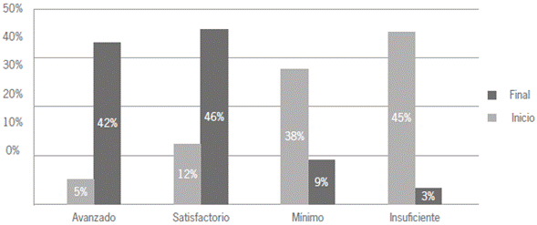 Contrastando los porcentajes de interacción inicial y final en la implementación del PLE, de manera general, se observa en la figura 2 que los resultados obtenidos inicialmente se encontraban en niveles mínimos o insuficientes y que, con la implementación del PLE, pasaron a avanzados y satisfactorios. Las interacciones de los estudiantes en el PLE se encontraban inicialmente con un 5 %, para pasar al 42 % en nivel avanzado, en el nivel satisfactorio se pasó del 12 % al inicio al 46 % al final, para un total de 88 % de los estudiantes que lograron avances en su proceso de aprendizaje. El 12 % restante está distribuido con el 9 % en nivel mínimo de estudiantes a los que se les dificultaron los procesos, o requieren más tiempo para ellos, y el 3 % de los estudiantes con dificultades en la implementación de su PLE por razones como ausentismo o desinterés.