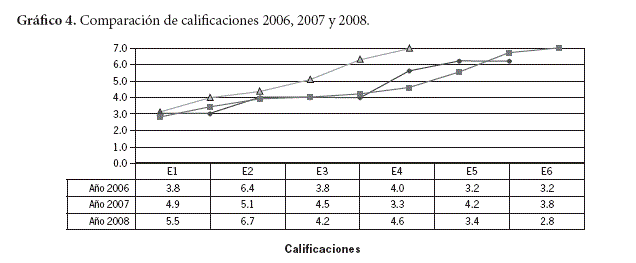 Al revisar la figura se aprecia que las calificaciones finales de los trabajos escritos durante los tres años estudiados han ido en ascenso. El punto inicial ha sido similar en cada año, pero el punto de llegada mejoró en los períodos 2007 y 2008. Hay que agregar que esta mejoría posiblemente se debió al hecho de que las tutorías, en las cuales se revisaban los borradores fueron obligatorias durante dicho período.