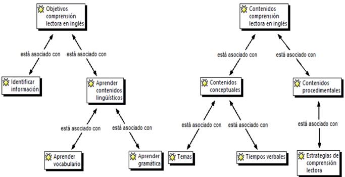 Figura 1: Red conceptual asociada a Creencias de futuros profesores de inglés sobre objetivos y contenidos asociados a la habilidad de comprensión lectora.