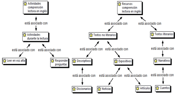 La categoría Creencias de futuros profesores de inglés sobre actividades relacionadas con la habilidad de comprensión lectora, que se ilustra en la Figura 2, permite identificar la subcategoría actividades durante la lectura. Por otro lado, la categoría Creencias de futuros profesores de inglés sobre recursos relacionados con la habilidad de comprensión lectora, expuesta también en la Figura 2, presenta las subcategorías textos no literarios y textos literarios.